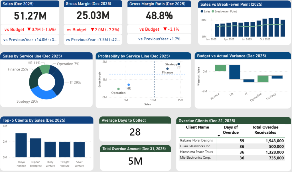 必要な経営指標を一画面で把握し、経営会議での意思決定のスピードと精度を高めるためのPower BIダッシュボードです。